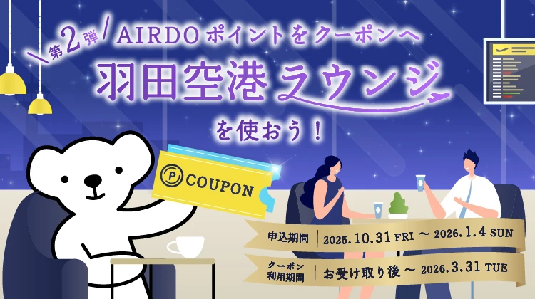 AIRDOポイントを羽田空港第2ターミナル POWER LOUNGE NORTHで使えるクーポンに交換できます。 ご家族、ご友人がクーポンをお持ちいただいた場合でもお使いいただけます。 ※お申し込みは1会員につき1回のみ、各クーポン最大5枚までお申し込み可 |