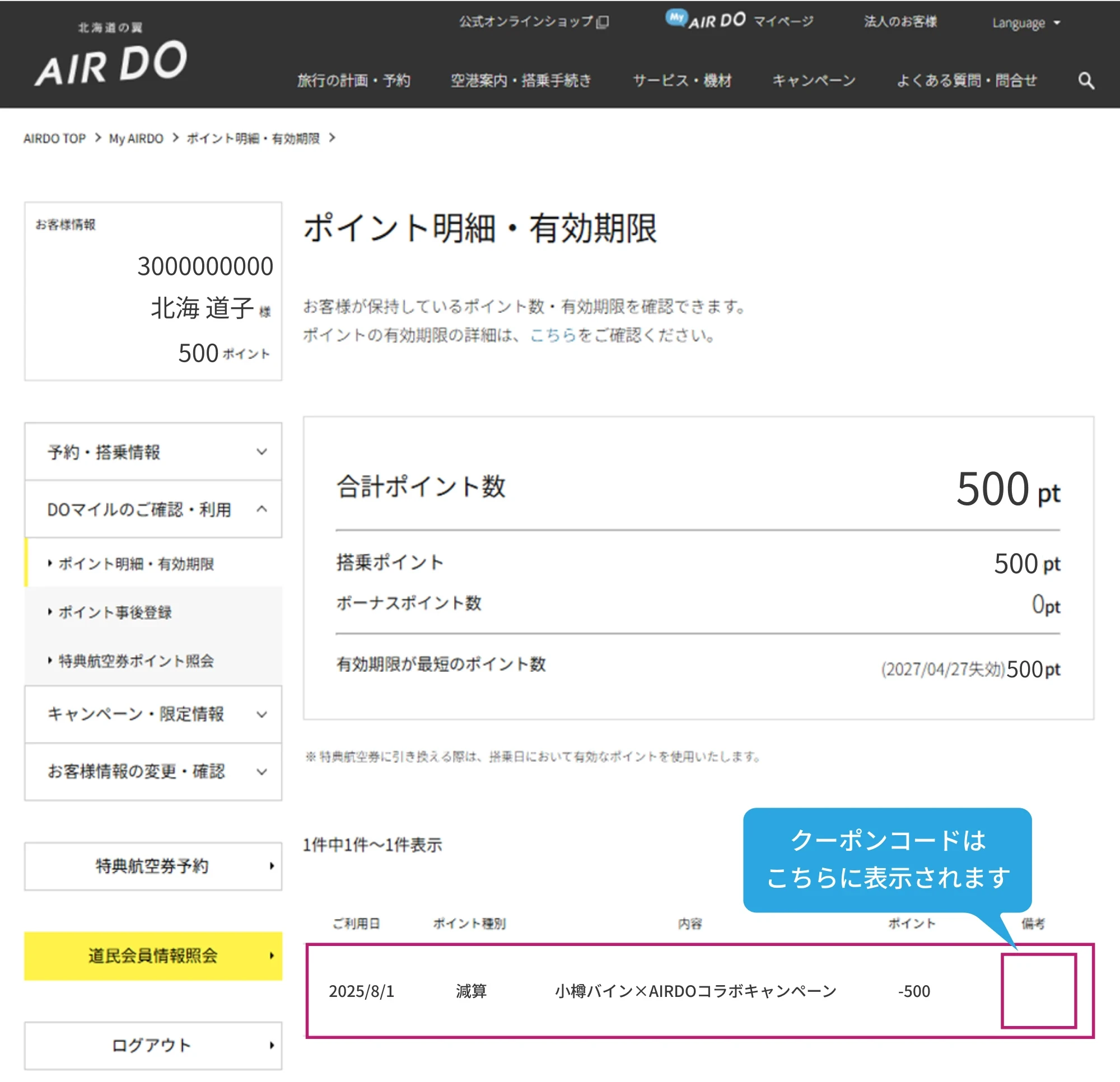 お申し込み前にMyページでAIRDOポイントの残高と有効期限をご確認ください。 ポイント残高・有効期限の確認