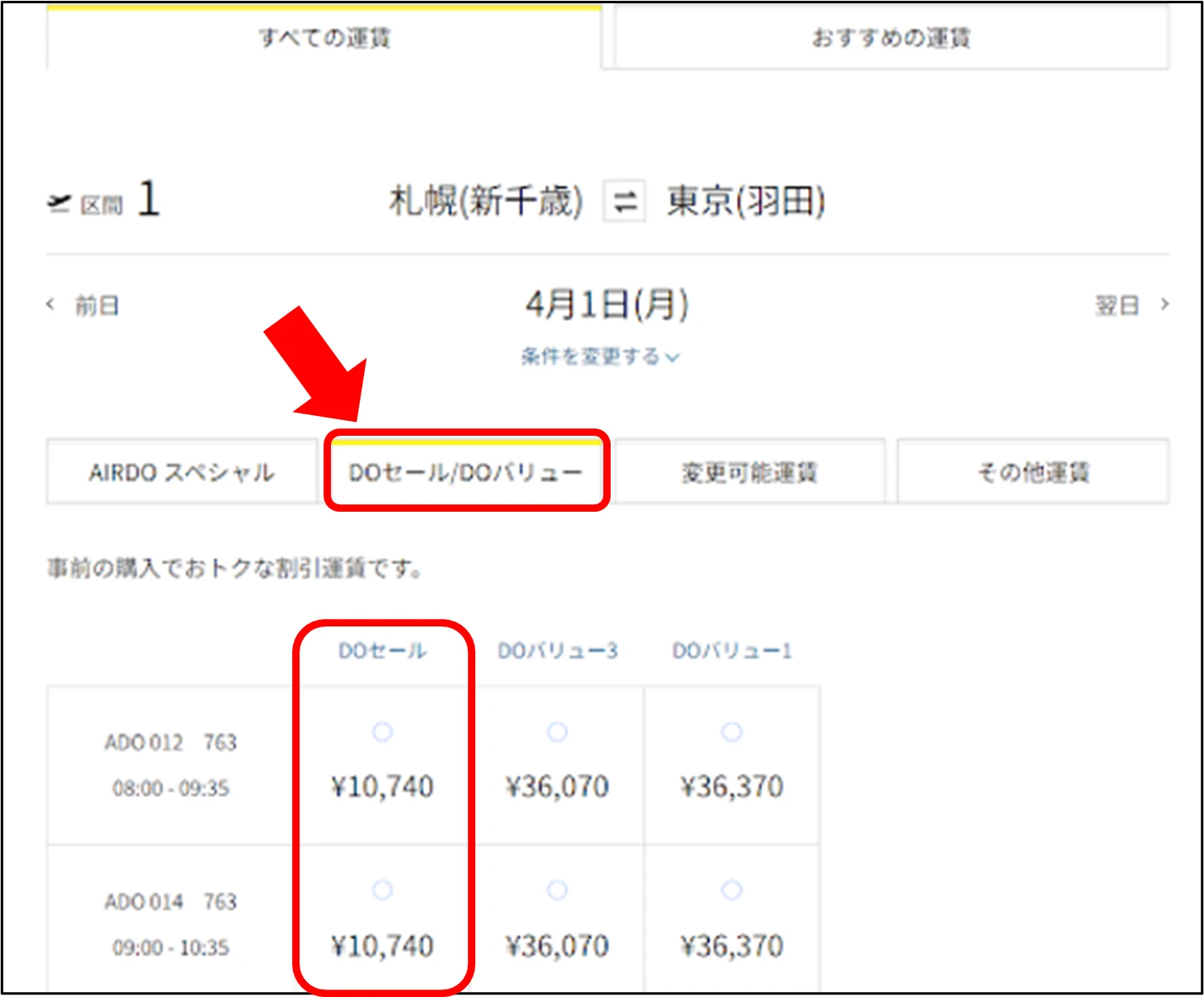 DOセールは、エア・ドゥ公式Webサイトの「航空券の予約」より区間やご搭乗日等を選択・検索し、「DOセール/DOバリュー」のタブより空席状況をご確認いただけます。