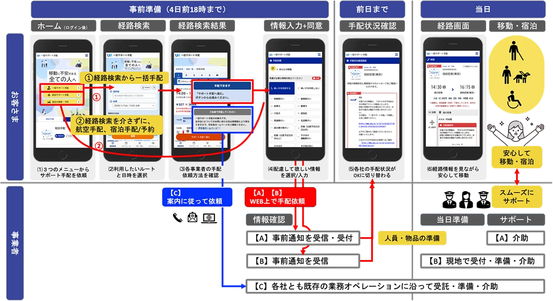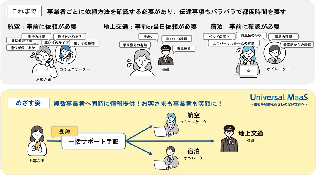 今回の実証実験では、航空、鉄道、バス、タクシー、宿泊施設との連携を強化し、お客さまの利便性向上を図ります。例えば、お客さまが各事業者に介助を依頼される際、これまでは事業者ごとに連絡先や依頼方法を調べ、個別に確認する必要がありました。今回の連携事業者拡大により、お客さまの確認作業の負担を軽減するとともに、各事業者においては、介助を必要とされるお客さまの効率的な情報収集が可能となります。
