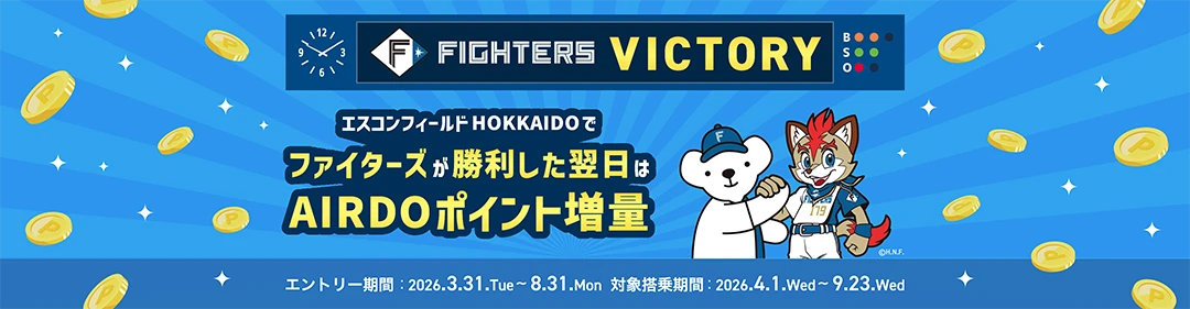 株式会社AIRDO(以下:エア・ドゥ)は、北海道日本ハムファイターズ(以下:ファイターズ)とのタイアップ企画(第2弾)を実施します。今回は、ファイターズが勝利した試合の翌日に航空券をご購入いただいたお客様へ、通常搭乗時に付与されるAIRDOポイントに加え、ボーナスポイント100ポイントをプレゼントします。また、本キャンペーンは、ファイターズのホーム開幕戦となる2026年3月31日(火)~8月30日(日)の期間にエスコンフィールドHOKKAIDOで開催される公式戦が対象となります。