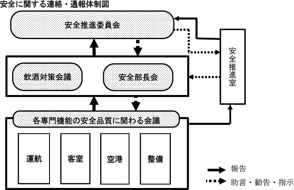 弊社は、航空法に基づき、「安全管理規程」において、安全管理の方針、体制、実施方法について定めています。また、安全統括管理者を選任し、経営トップから運航、整備、客室、空港業務などに直接携わる社員を含む会社全体で、航空輸送の安全に対し組織的に取り組む「安全管理システム」(以下「SMS」という。)を構築しています。