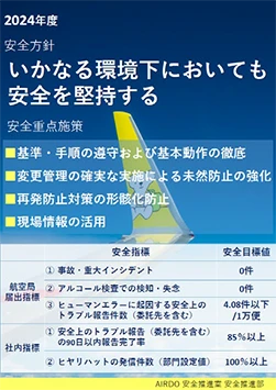 弊社は2024年度の安全方針として、「いかなる環境下においても安全を堅持する」を掲げ、全社を挙げての安全管理システム(SMS)の推進をはじめ、各種の安全対策を確実に実施したことで、全ての安全目標を達成することができました。さらに初便就航から継続している「航空事故、重大インシデント0件」の記録につきましては、本年度におきましても達成することができました。