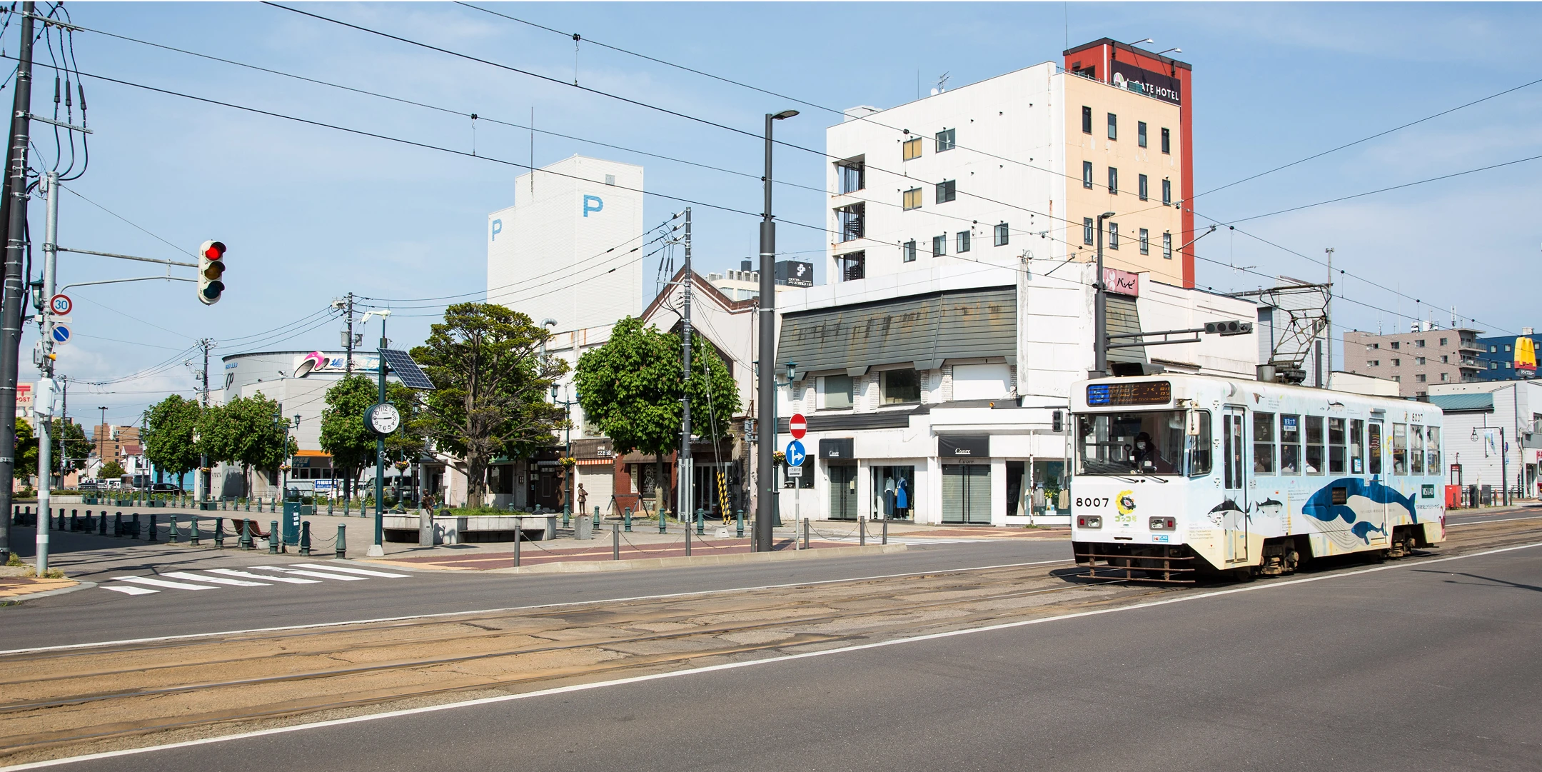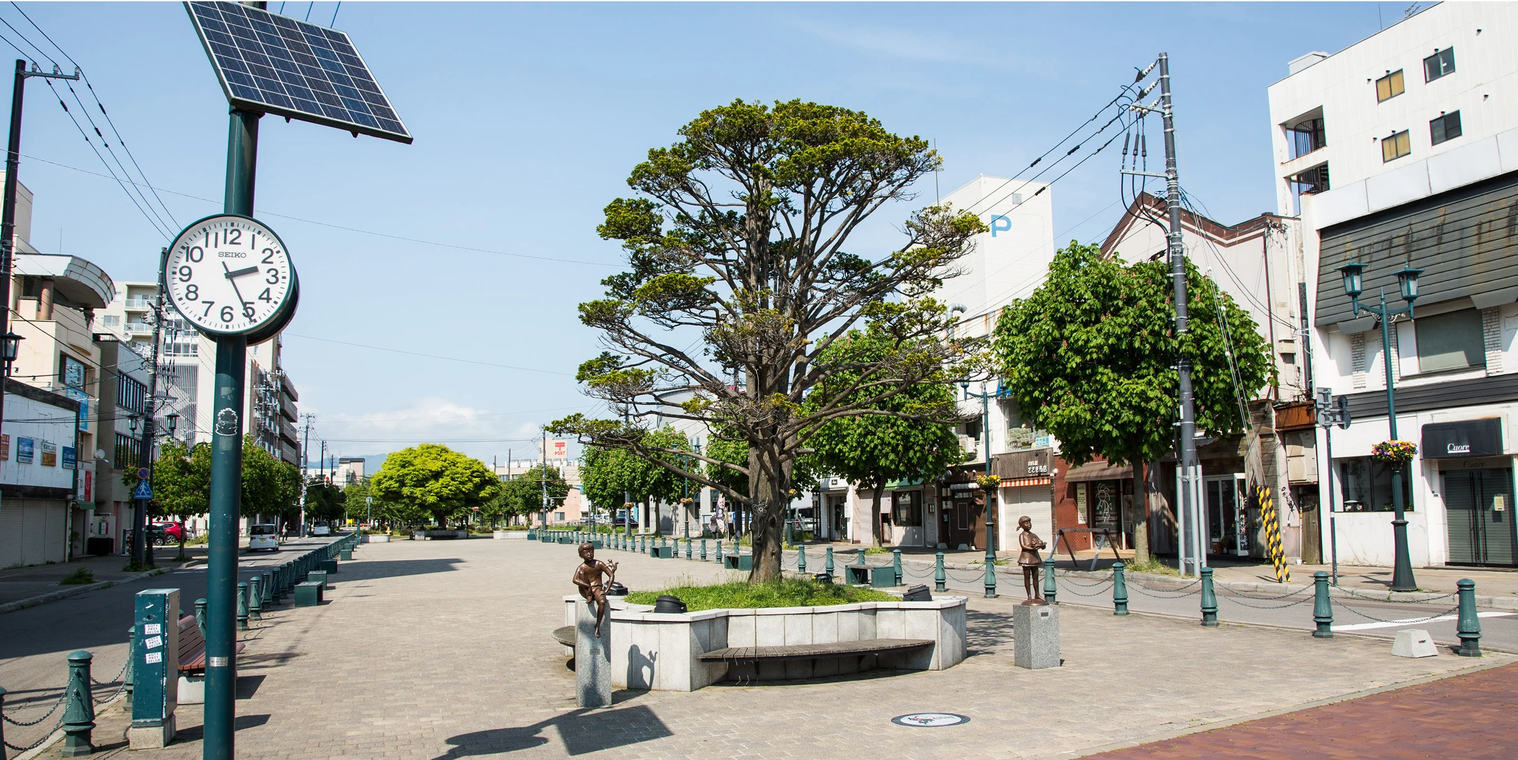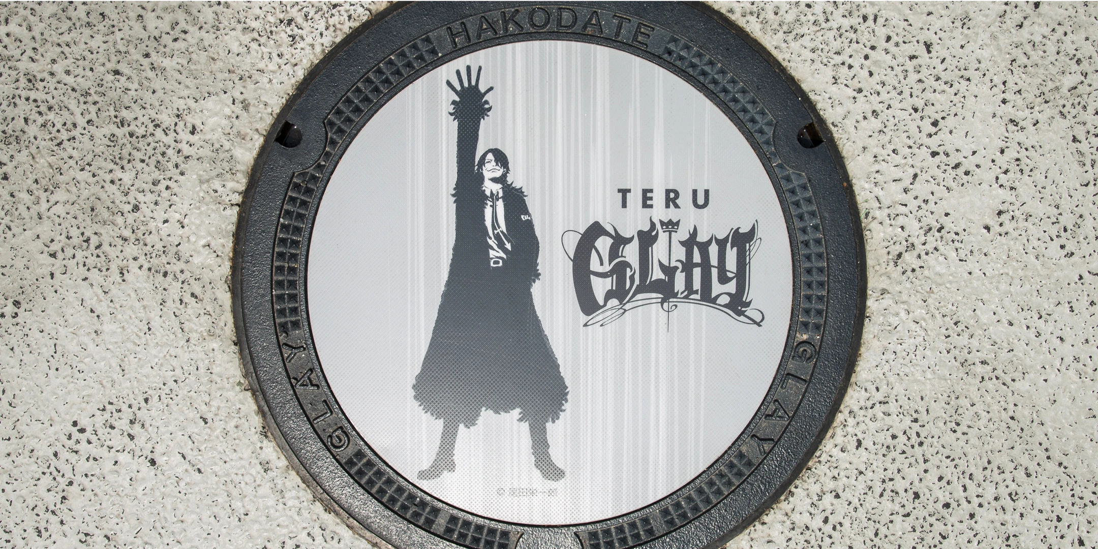 さて、GLAYマンホールを巡る前に、まずは設置までの経緯をご紹介しておきましょう。このマンホールは昨年(2024年)、函館市排水設備指定業者協同組合の設立50周年を記念して、同組合から函館市に寄贈されたものです。同組合は下水道の維持・修繕工事を請け負う地域の事業者の組織で、下水道のイメージアップや函館の観光振興を目的に企画されたそう。まずは2024年11月に、メンバー4人の集合デザインを市内3箇所に記念設置。2025年3月から、個人デザイン4点と集合デザイン1点を、市内5箇所に路面設置しています。ということで、まずはJR函館駅前にあるボーカル・TERUのマンホールを探しに行くことに。