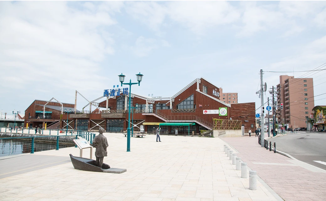 お次は、ベースのJIROのマンホールを探しに行きます。場所は、函館屈指の観光スポット、金森赤レンガ倉庫の近く。大型おみやげ店・函館西波止場の裏手にある広場です。その広場内にある新島襄の像と函館西波止場の建物の間に、ありました!