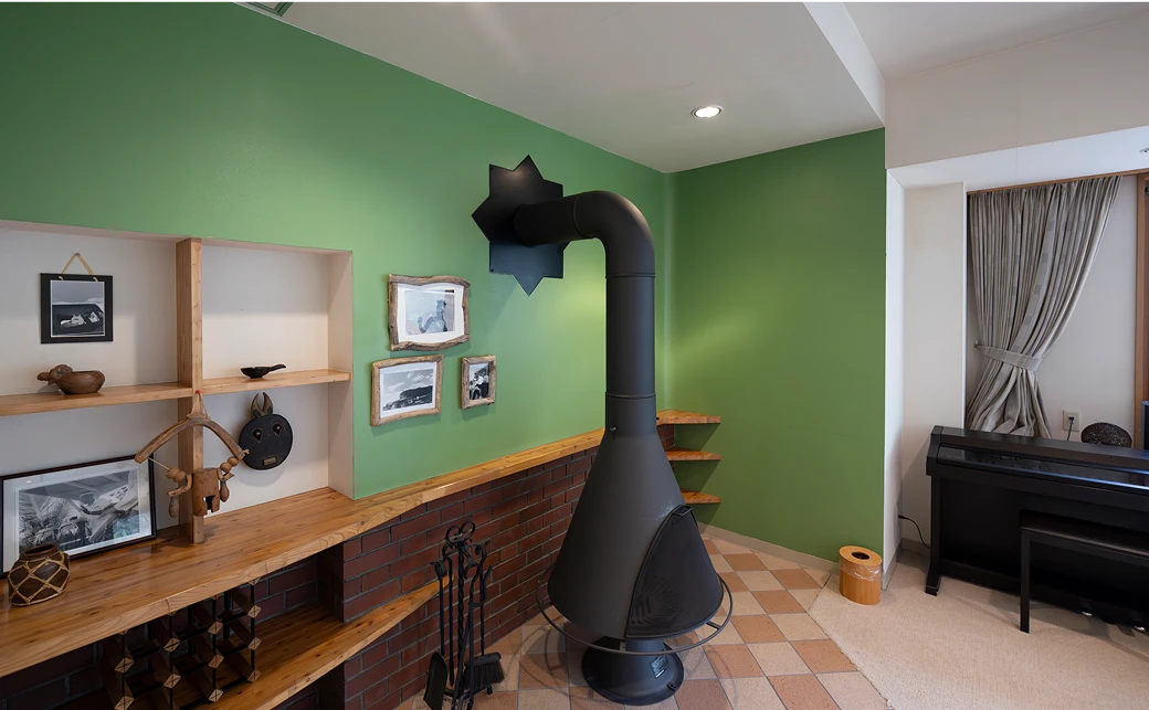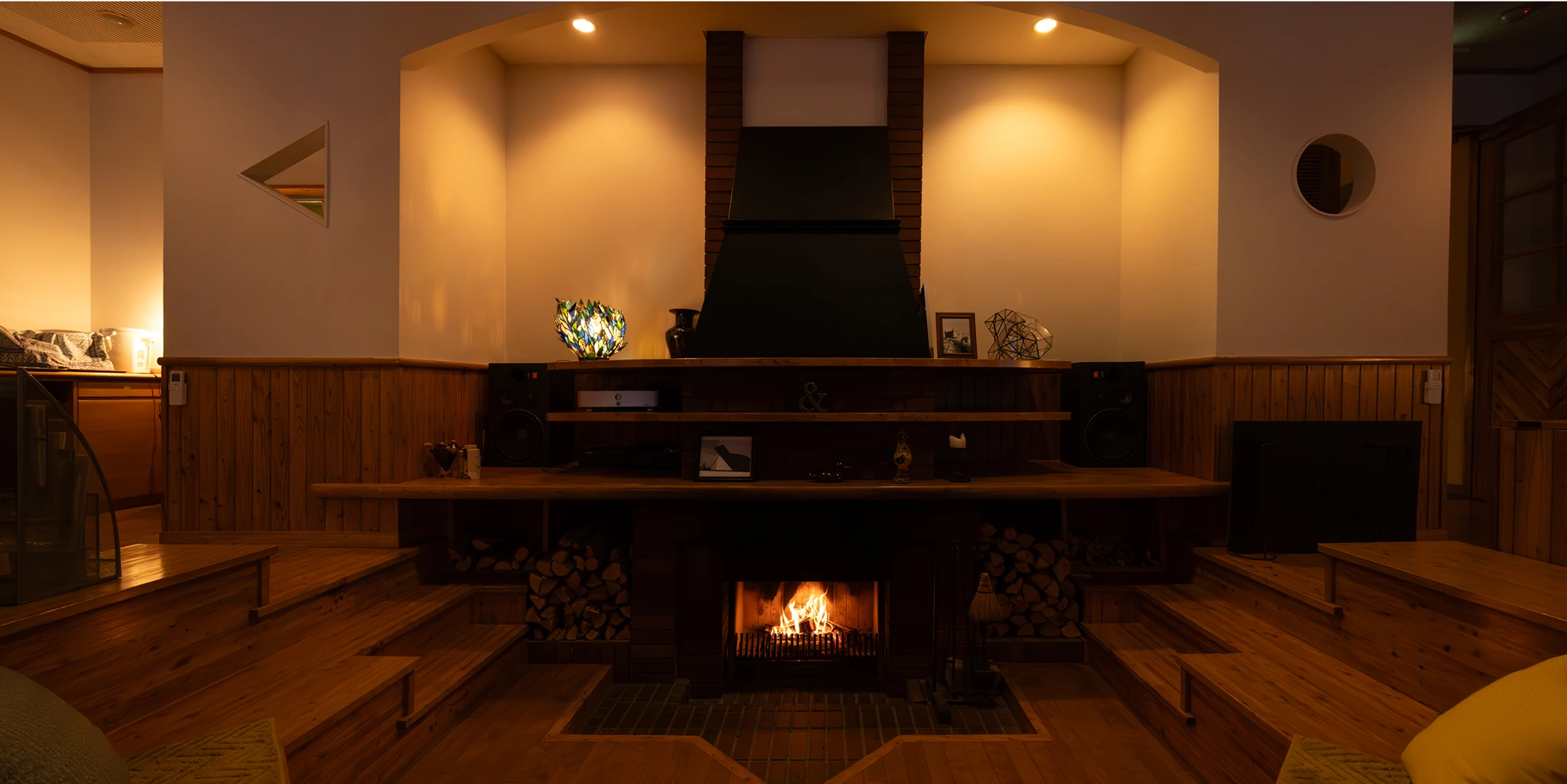リビングには暖炉があり、冬はゆらめく炎と薪のはぜる音を聞きながら、ゆったりと過ごすことができます。