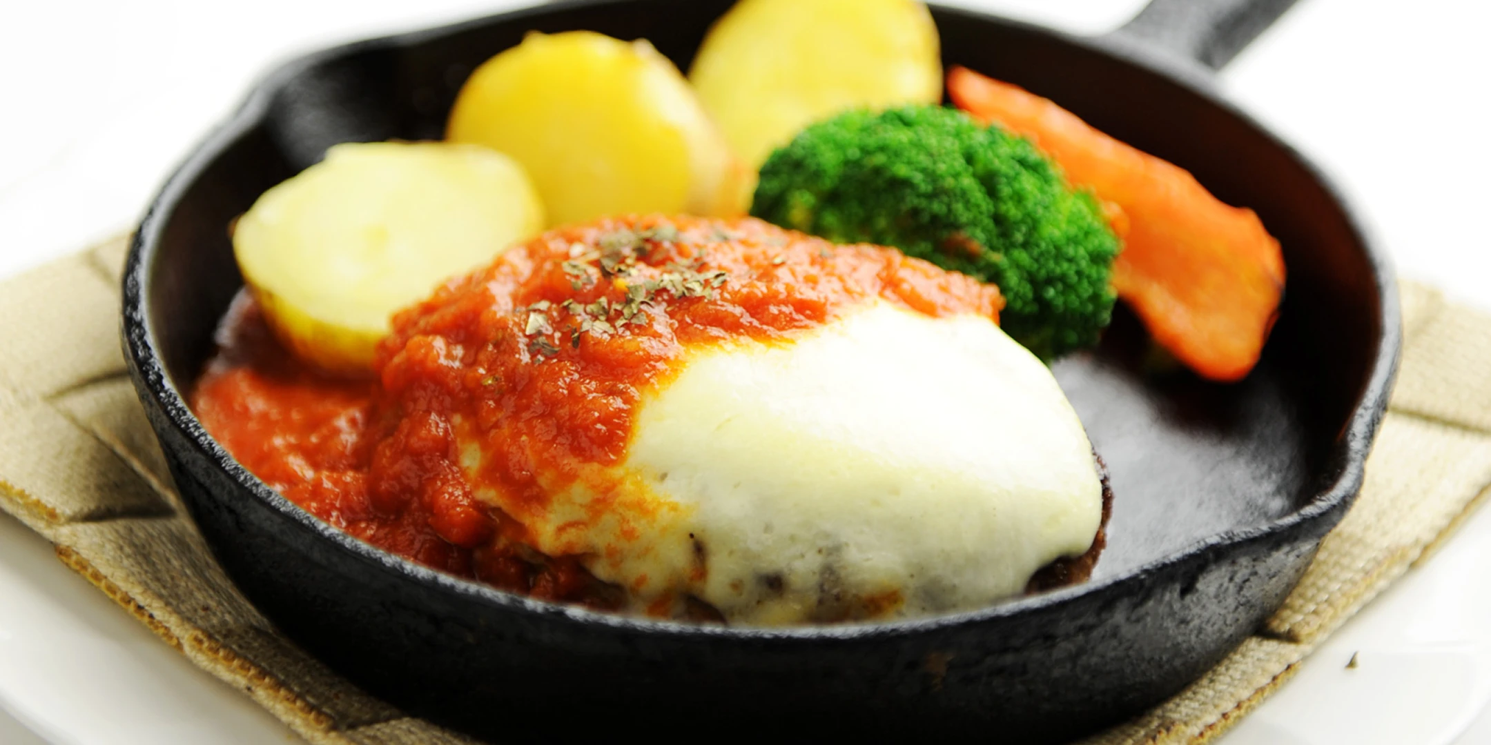 一番人気は「モッツァレラチーズハンバーグ」。北海道産牛肉100%の肉汁がジュワっと広がるハンバーグに、コクのあるおこっぺ有機モッツァレラチーズと、程よい酸味のトマトソースをたっぷりかけた逸品。付け合わせの野菜も味が濃くて、食べごたえバツグン。