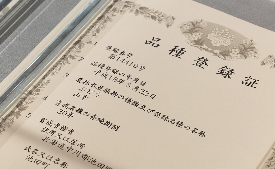 そこで注目したのが、十勝の寒い山野でもたわわに実る山ブドウ。これに「清見」を交配して生まれたのが、「山幸(やまさち)」と「清舞(きよまい)」です。特に「山幸」は色が濃く、山ブドウならではの野趣あふれる渋みと味わいが感じられる、これまでにない品種。2020年には「国際ブドウ・ワイン機構(OIV)」のリストに登録されました。