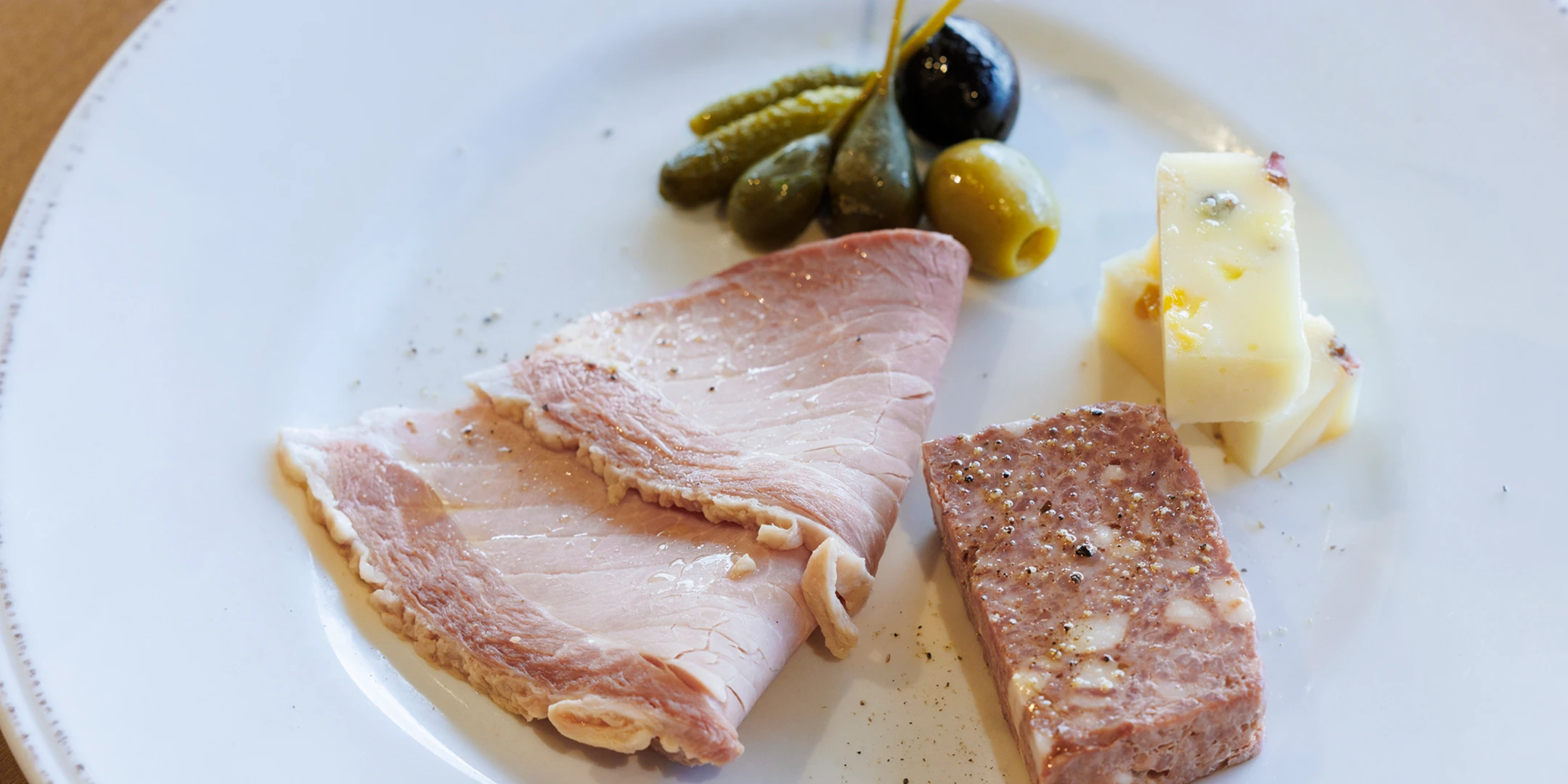 池田町・阿部農場の十勝産黒豚を使った、自家製ハムやテリーヌなどを盛り合わせたオードブル。自家配合した飼料とストレスを軽減した環境で飼育するため、まろやかな肉質とコクのある甘みが口に広がります。