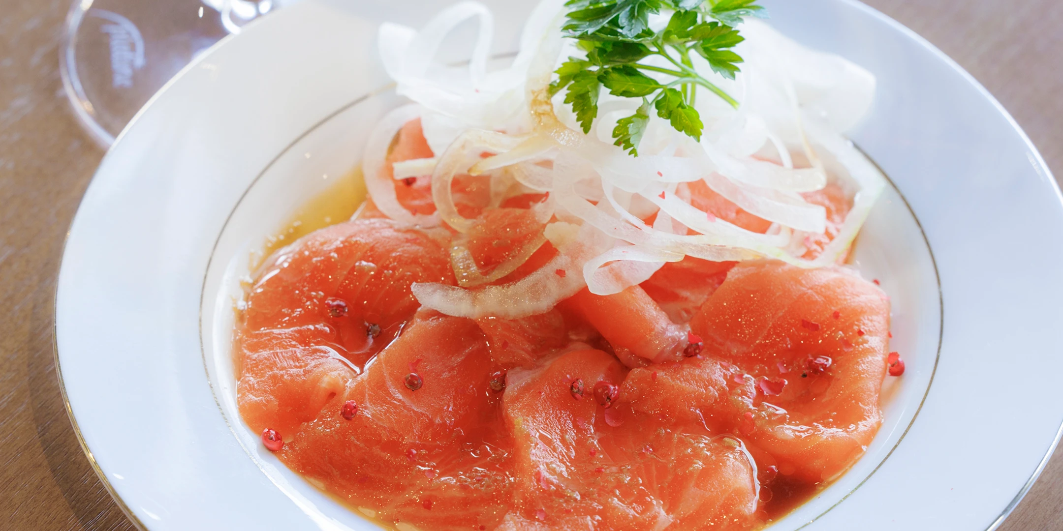 こちらは、池田町・竹中水産のドナルドサーモン(ニジマスの一種)を使用。湧き水で養殖しているので、生食でも安心して食べられます。発注してからさばいて納入されるため、とにかく新鮮。通年で脂ののったプリプリの身を味わえます。