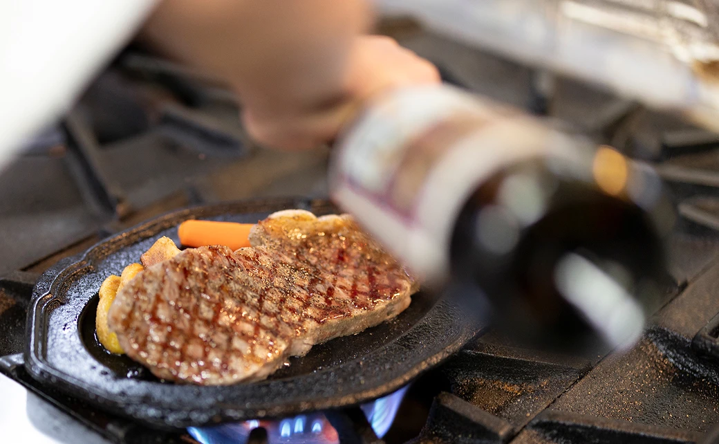 決め手は、仕上げに使う十勝ワイン。肉質をやわらかくし、脂のキレがいい、さっぱりとした後味に。これにより、いけだ牛のジューシーな肉汁と、芳醇な十勝ワインが打ち解け合うんです。