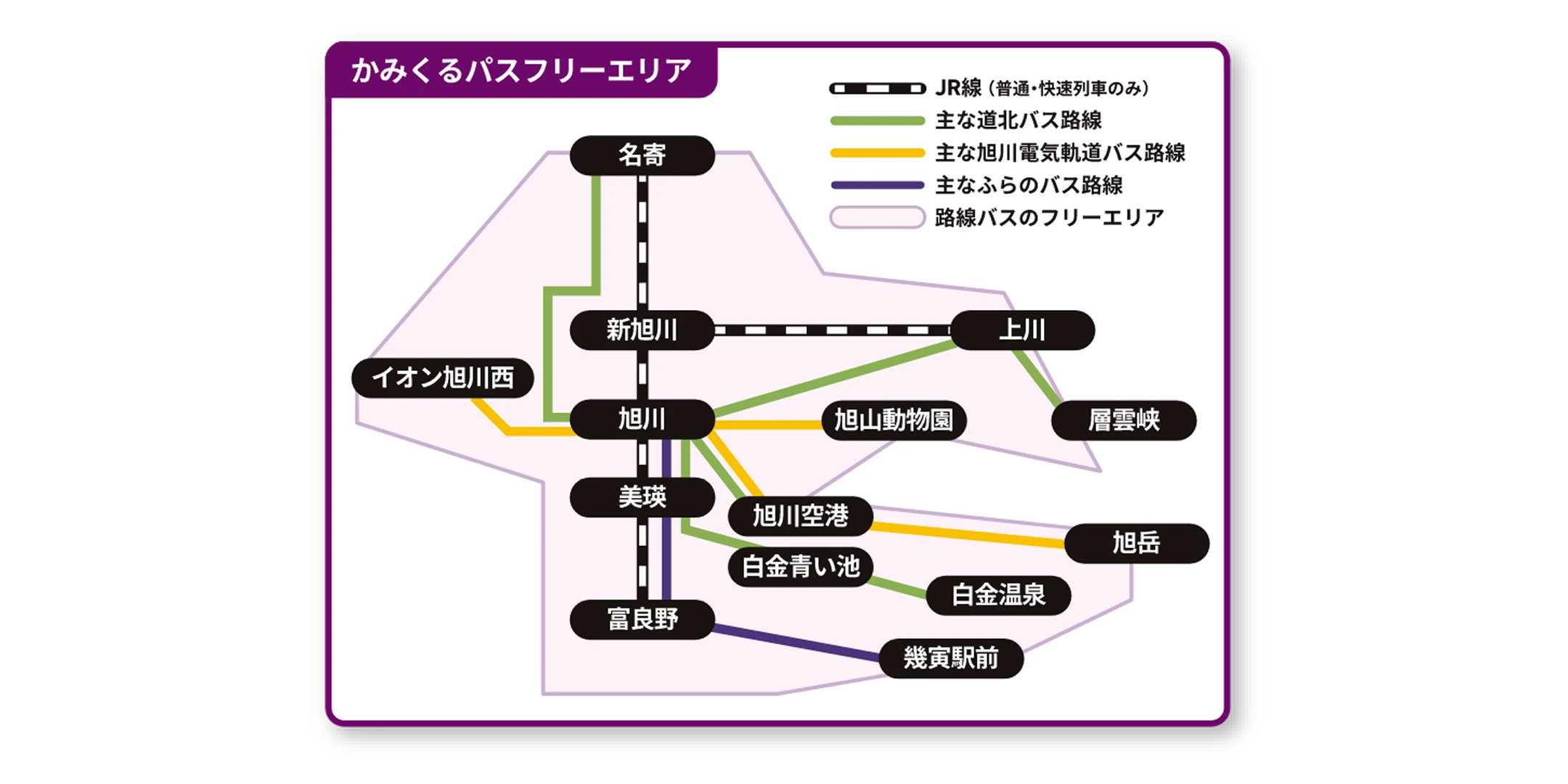 旭川市内はもちろん、北は名寄市、南は南富良野町、東は上川町層雲峡まで、エリア内であれば何度でも乗り降りが自由。運賃を気にせず移動できるので、広大な上川エリアを周遊するのに便利と、観光客から人気を集めています。