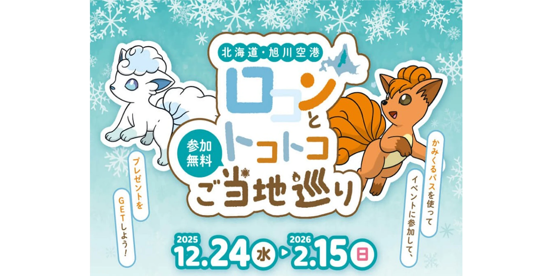 2月15日(日)までの期間中、旭川空港周辺や『かみくるパス』対象エリア内のスポットに、ロコンやアローラロコンの看板が出現。看板にある二次元コードをスマートフォンで読み取るとポイントが貯まり、獲得したポイントに応じて素敵なプレゼントと交換できます。