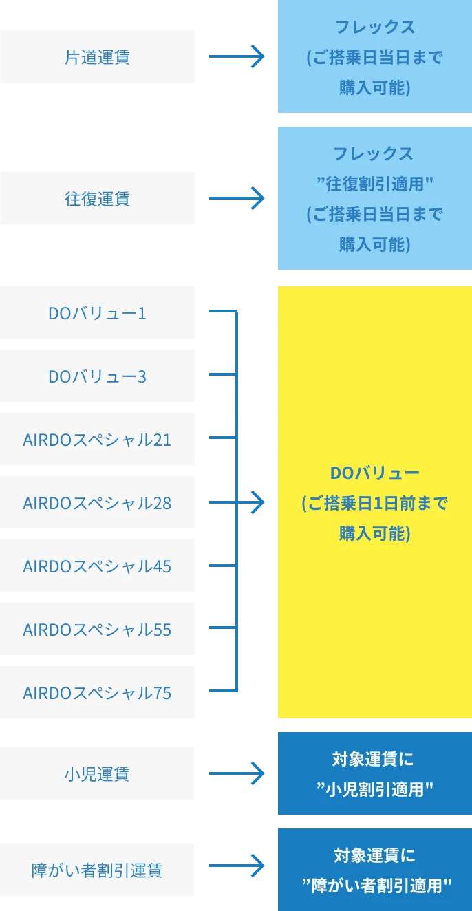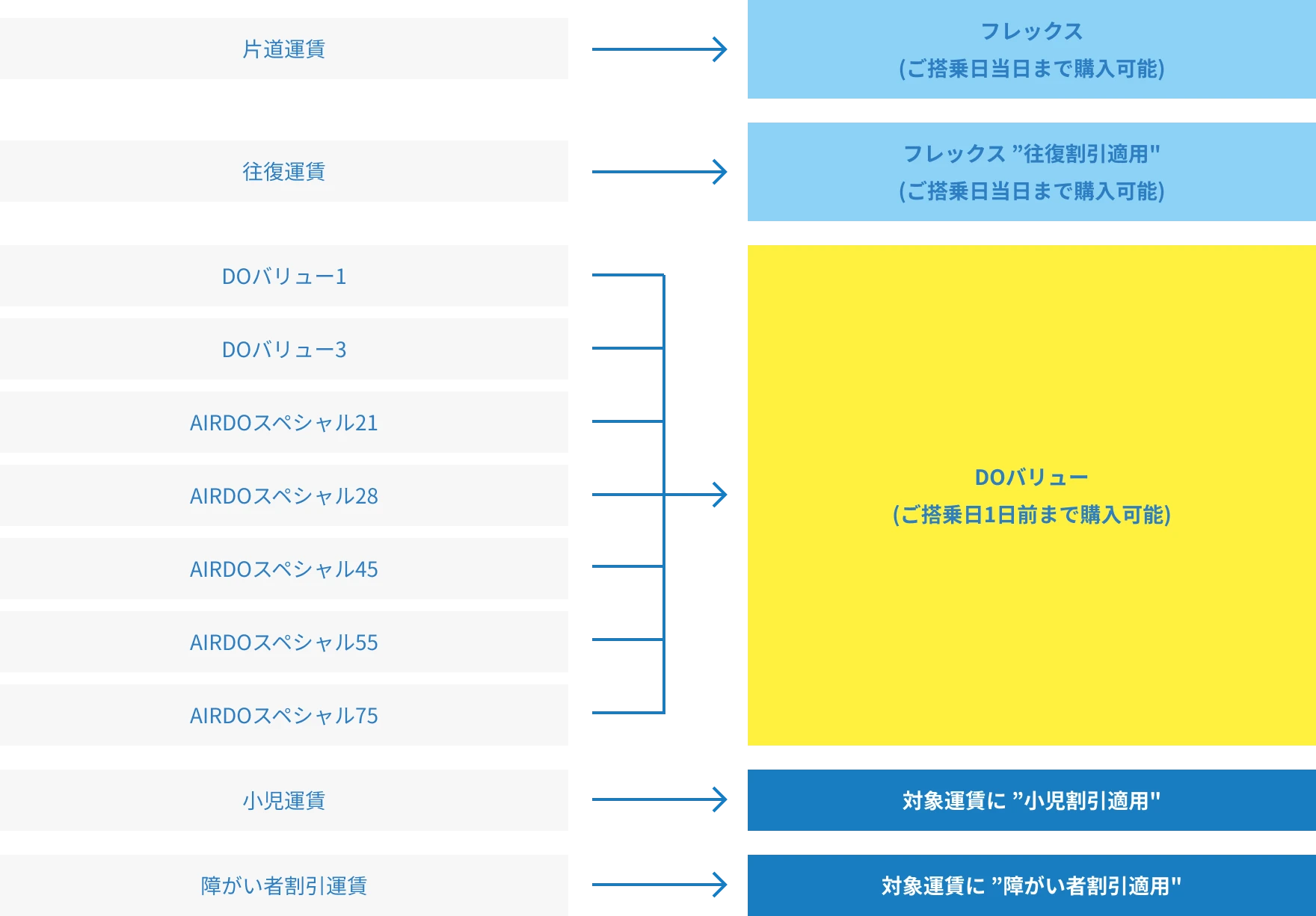 現在の「片道運賃」、「往復運賃」、「AIRDOスペシャル」、「DOバリュー」などの運賃がシンプルでわかりやすい運賃になります。