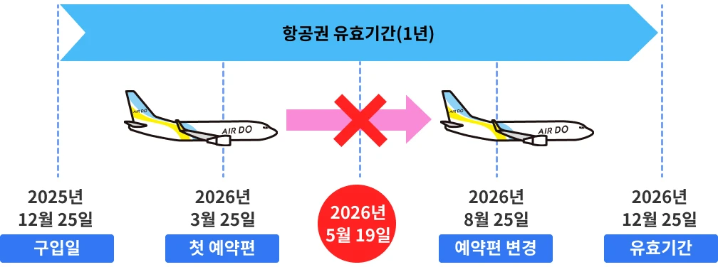 ■예약 변경 가능 운임에서, 구입 시의 예약편이 2026년 5월 18일까지인 항공권을 소지한 경우, 고객 사정에 의한 예약 변경으로 2026년 5월 19일 이후로는 변경할 수 없습니다.