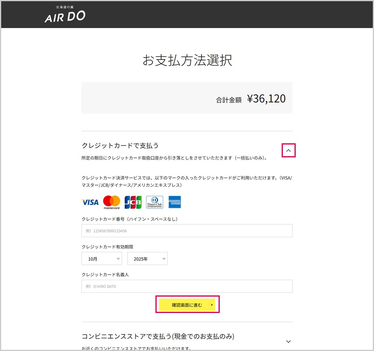 操作のヒント:クレジットカードでお支払いされる場合の手順
