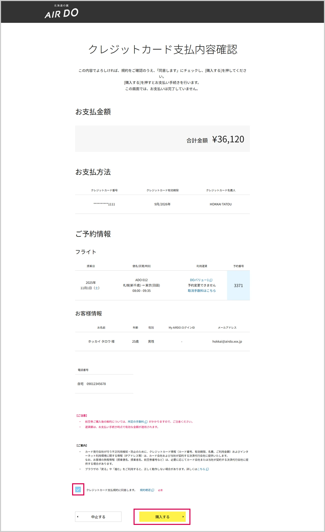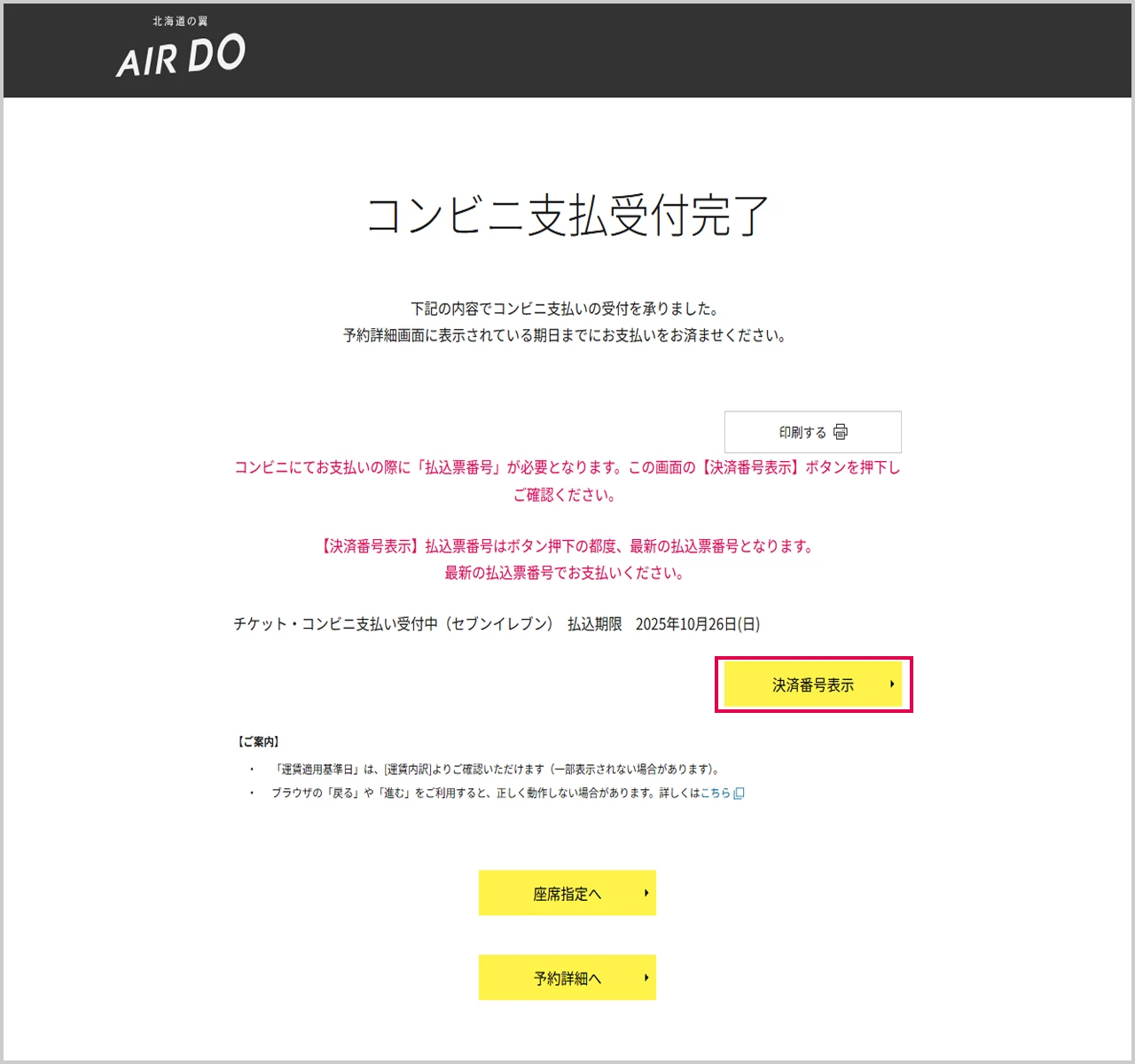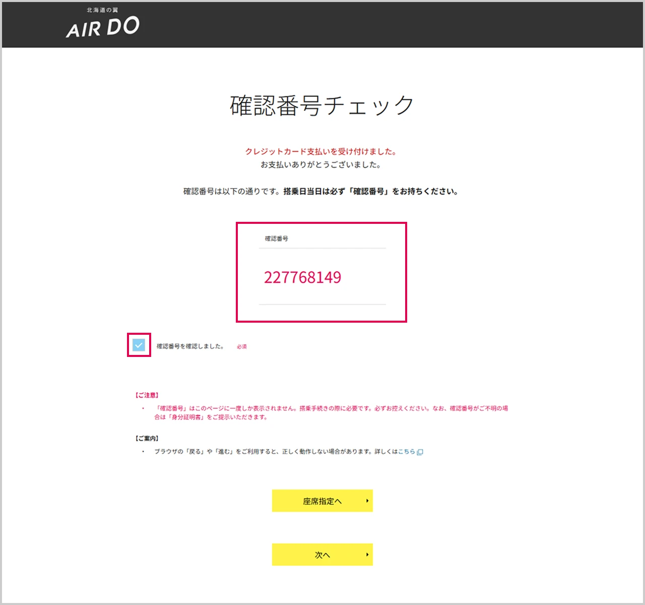 クレジットカードで決済した場合、確認番号はお支払い完了画面で1回のみ表示されます。