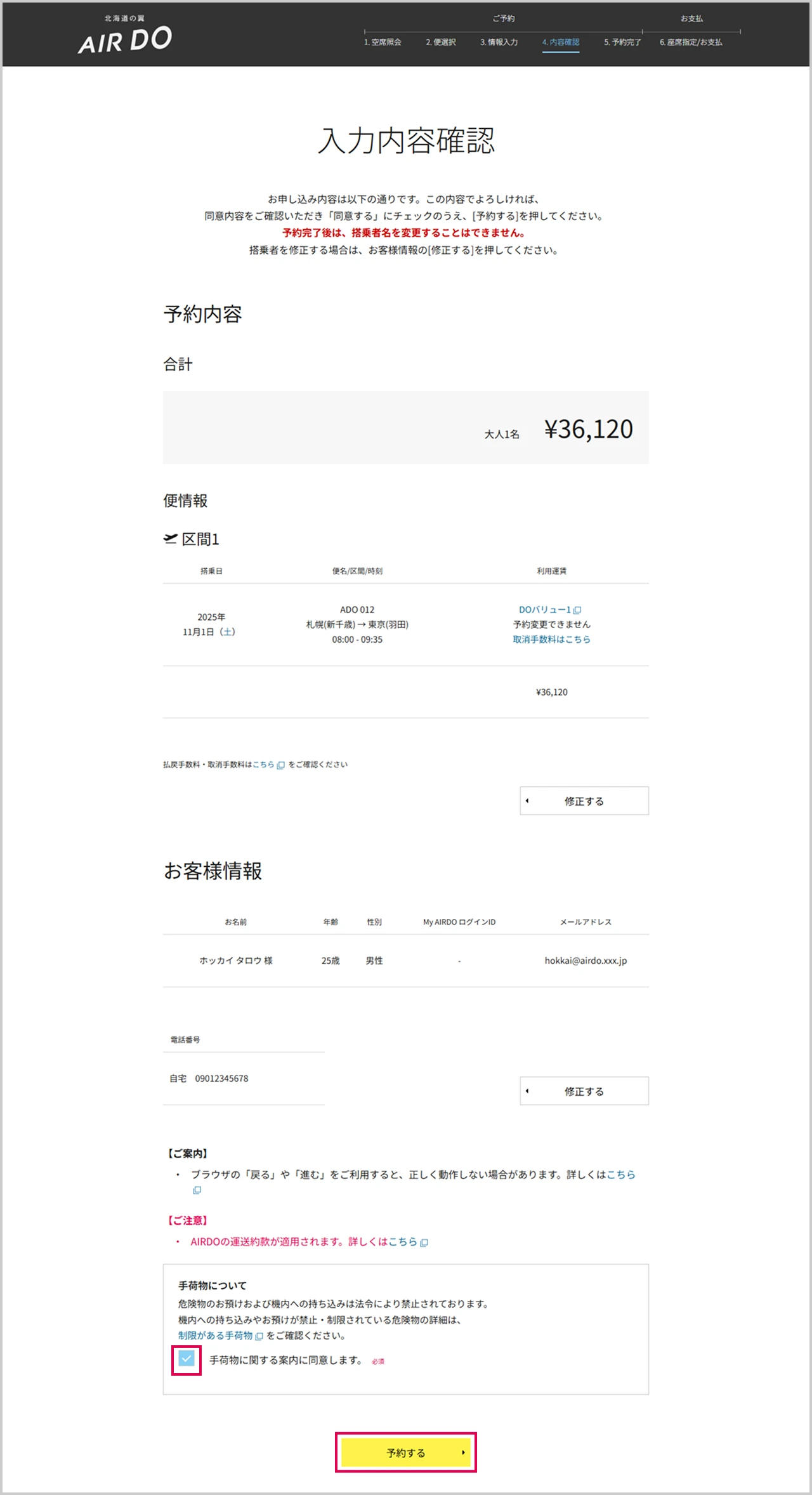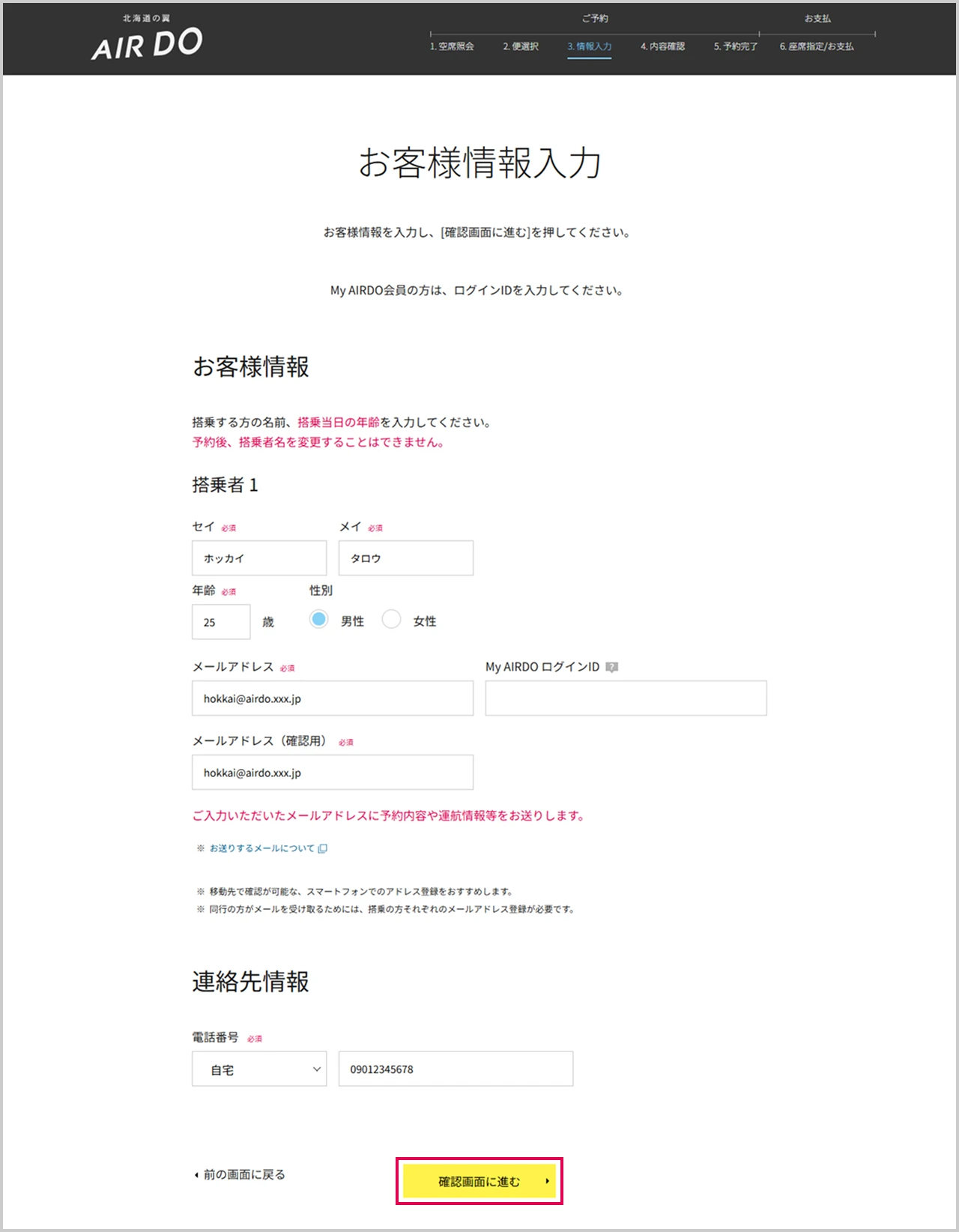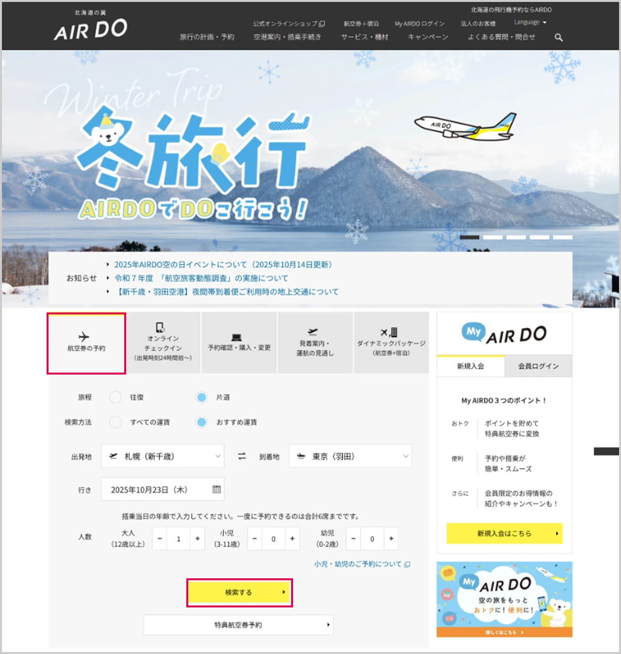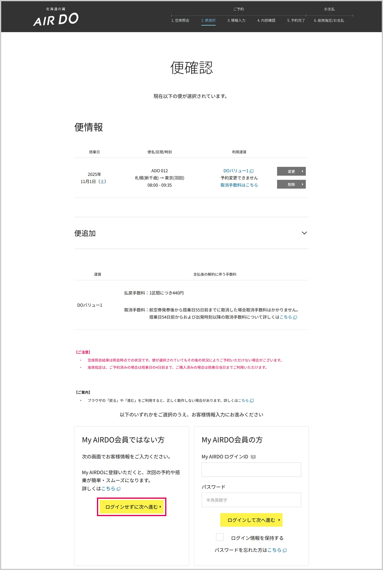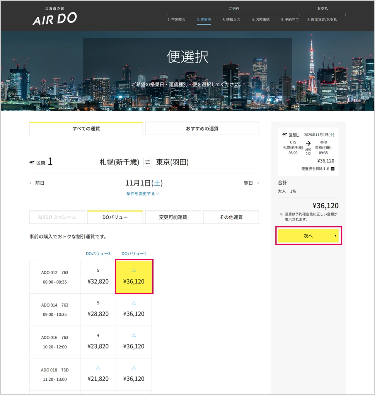 搭乗予定日の前後3日間の空席状況と運賃額を一覧で確認できます。ご希望のフライトを選択し、お客様の情報をご入力いただくだけで、どなたでも簡単にご予約が可能です。